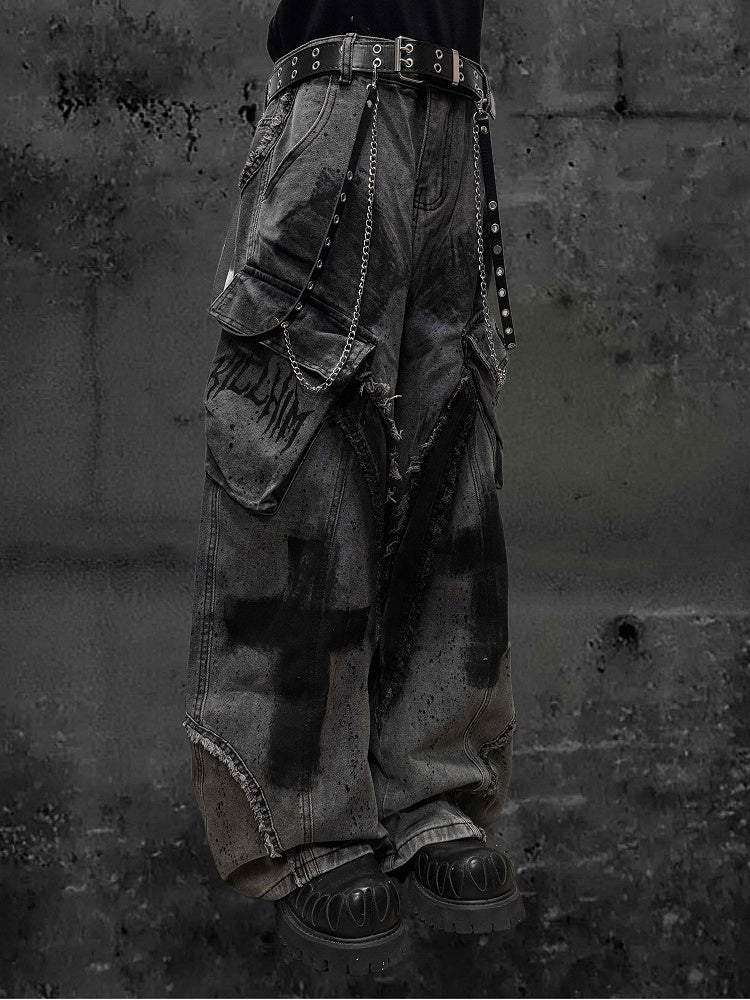 Raw Cross with Wide-Leg Grey Detailing Wasteland Hem Jeans Punk Y2K