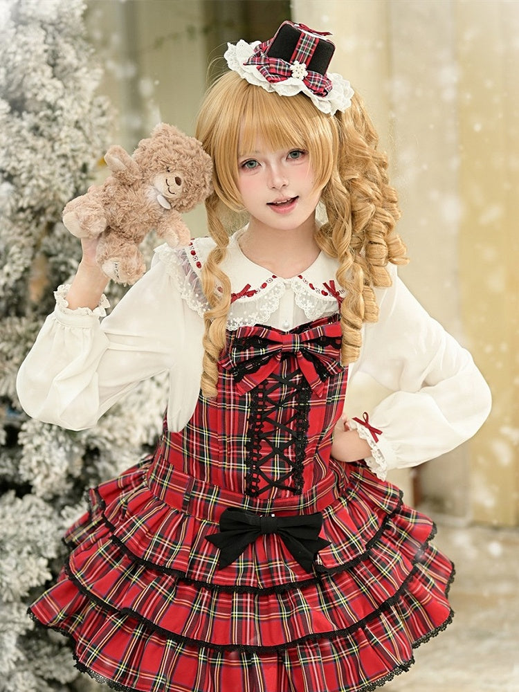 Red & White Peter Pan Collar Blouse with Lace Threading