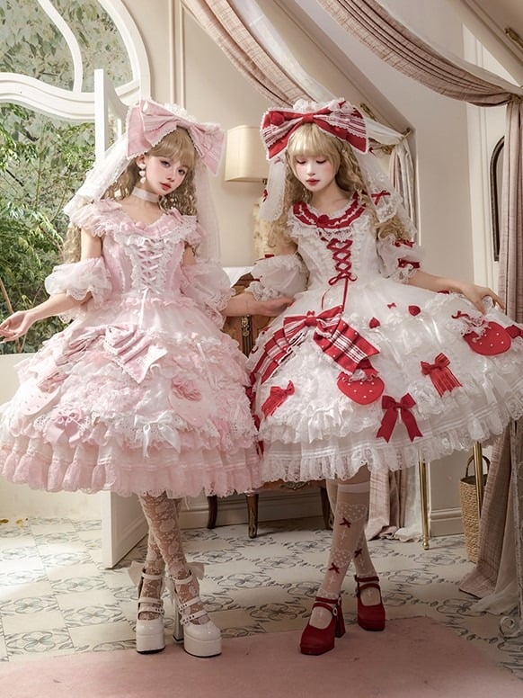 Red & White Lace Layered Sweet Lolita Dress with Ruffles and Bow Accents