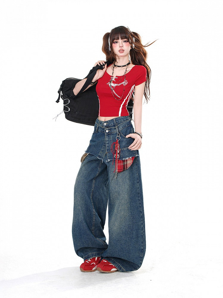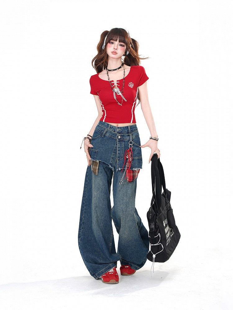 Red/Black Round Neck Glamorous T-shirt with Lace-up Detail at Front