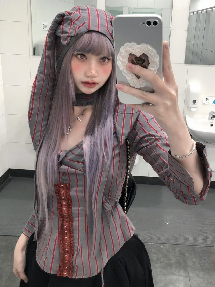Red Chin Striped Strap Hat Ear Bunny with Grey