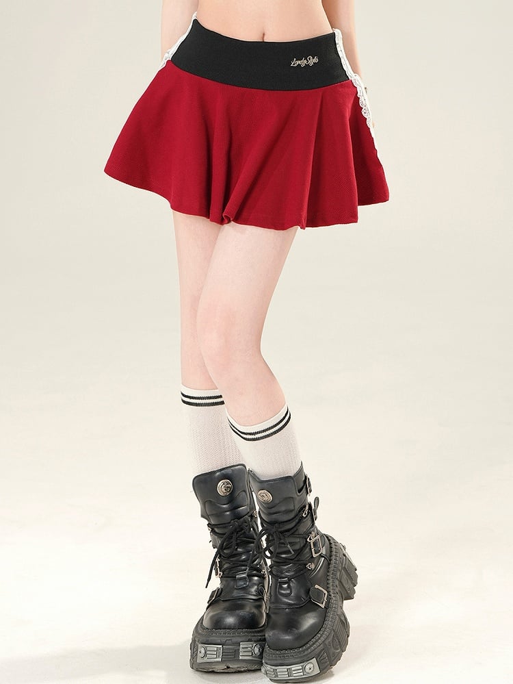 Red Glamorous Letter Embroidery Lace Trim Skirt