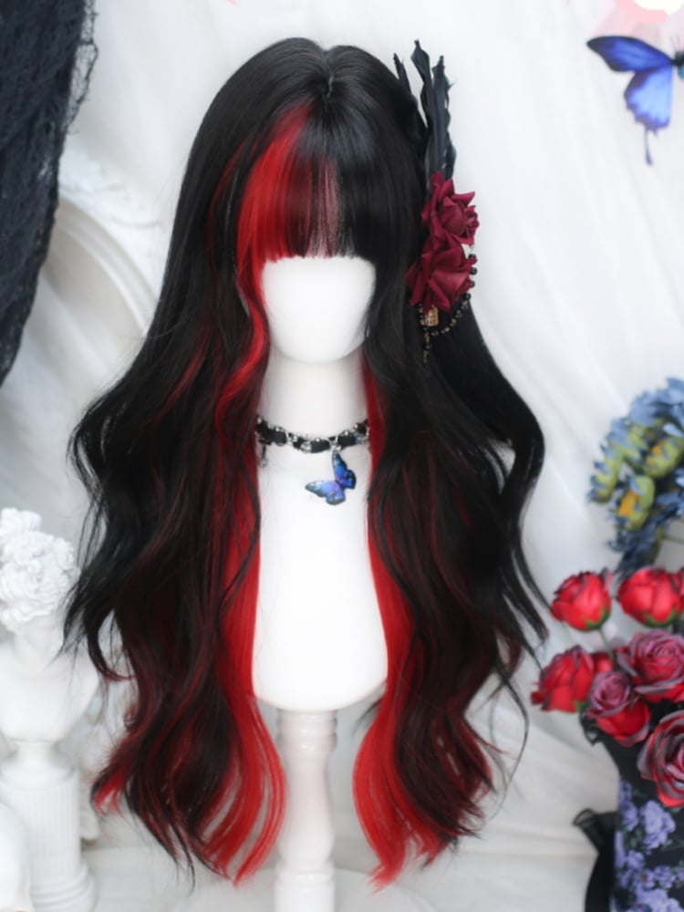 Redand Black Highlight Under Bust Length 65CM Wavy Wig with Full Bangs