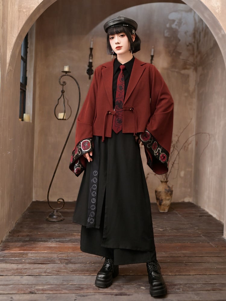 Black Cheongsam Asymmetrical Hem Regular/Thin Wide-Leg Pants with Metal Chain & Bird Print Ribbon Details