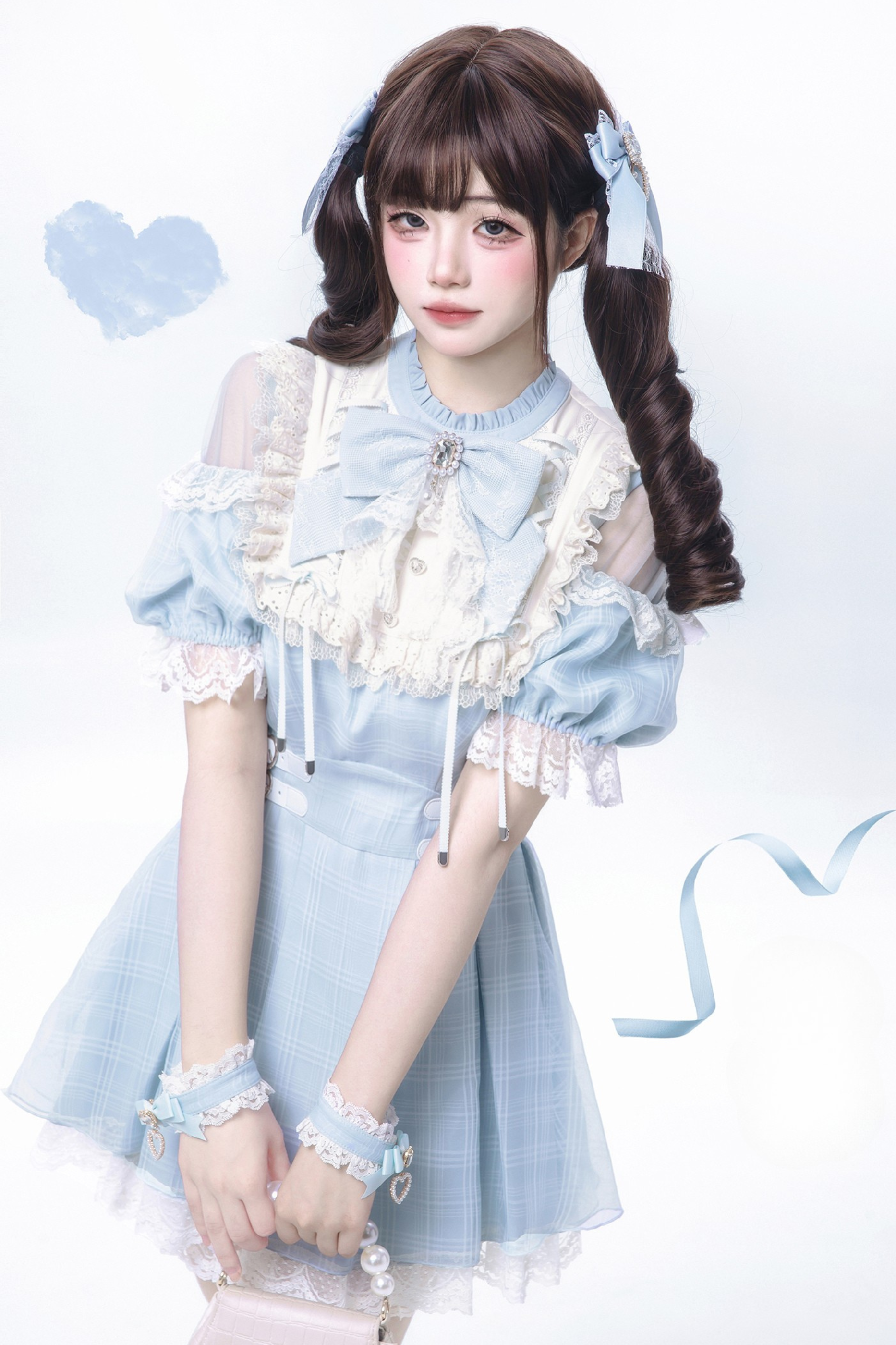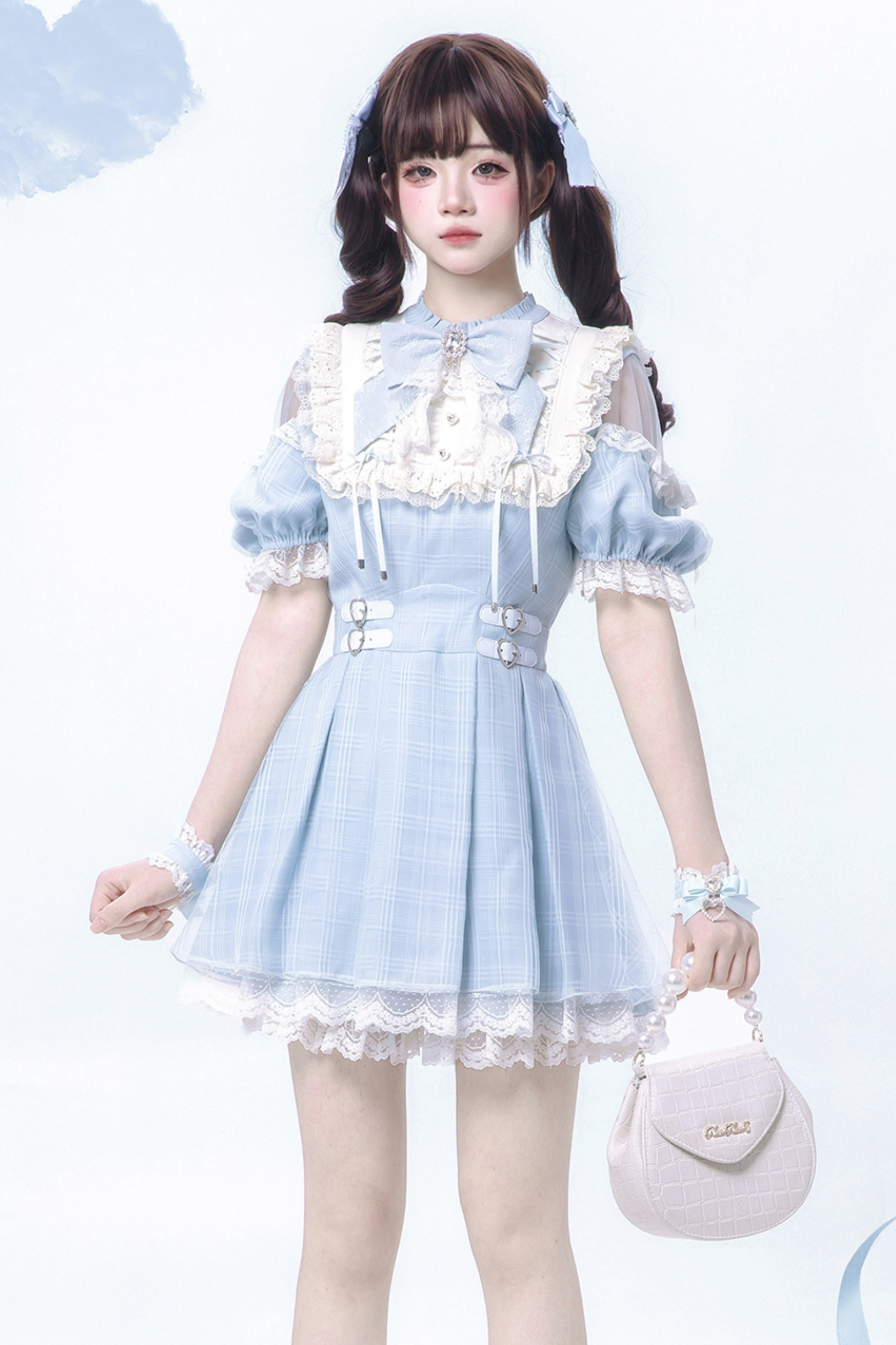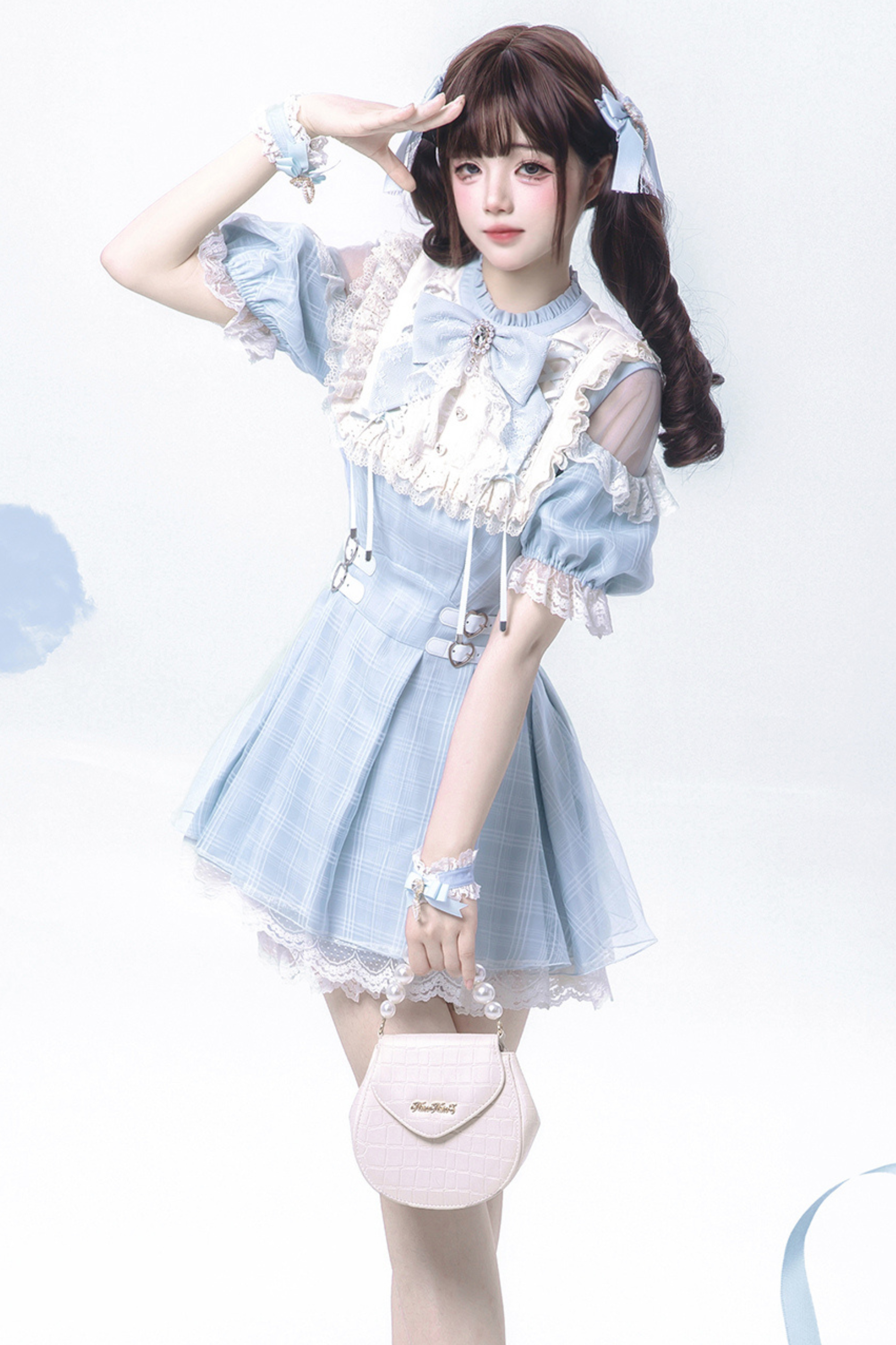 Blue and White Old School Lolita Fashion Dress Bowknot Detais JSK Set
