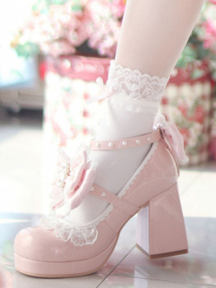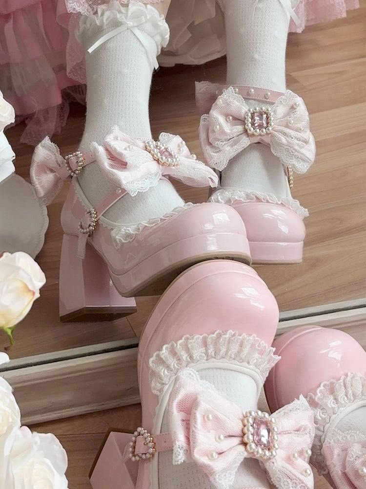 Polished Dusty Pink Detachable Rhinestone And Beaded Decorated Bowknot Lace Trim Platform High Block Heels