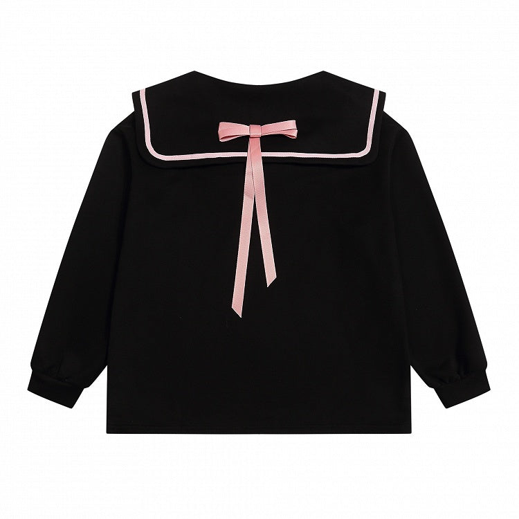 Ribbon and Girl Print Jirai Sweatshirt with Back Black/Pink Collar Bow Sailor - Kei Manga Style