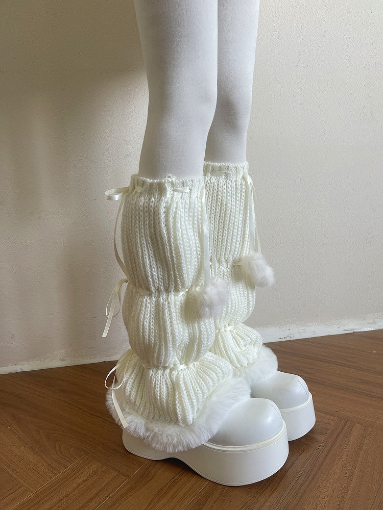 Ribbon Knitted Pom-Pom White/Black Plush-Trimmed Decorations and with Warmers Leg