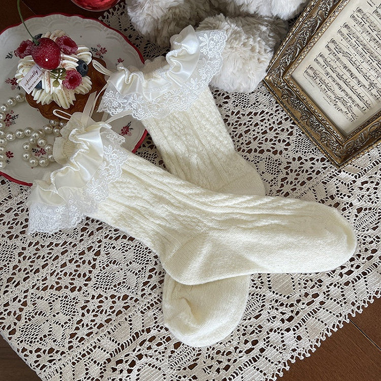 Cable-Knit Socks with Lace & Ribbon Cuffs