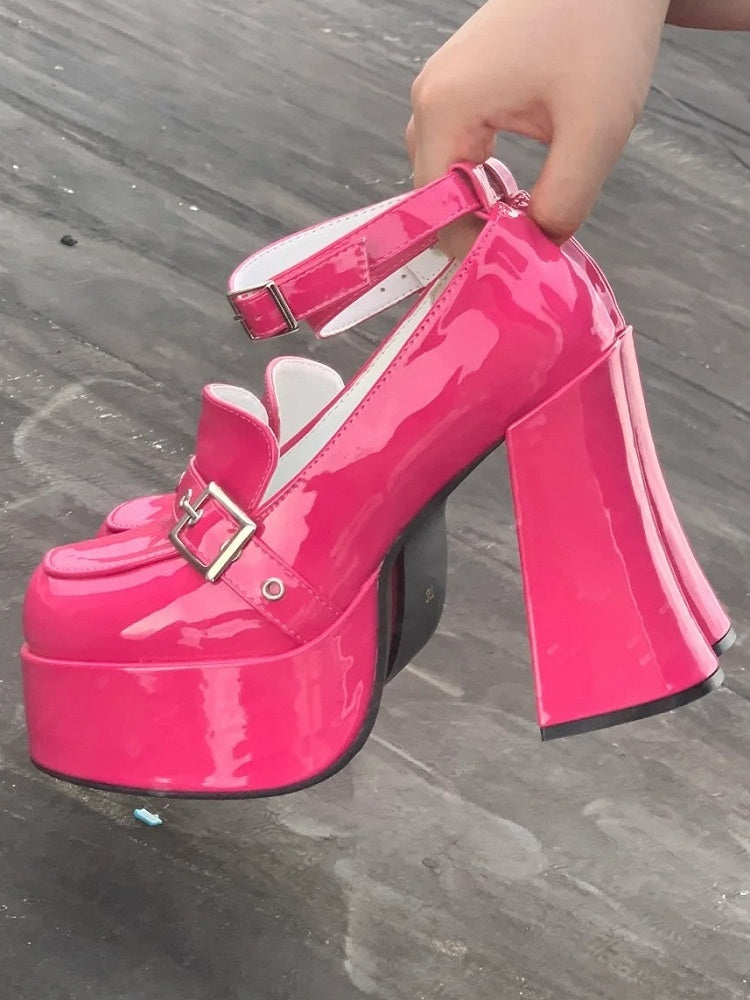 Rose Pink Punk High Block Heels in PU with Buckle Details & Detachable Ankle Strap