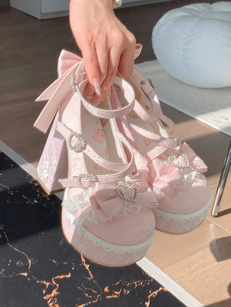 Pink Elegant Lolita Round Toe Platform High Block Heels - Bow Accents, Beaded Heart Details, Crisscross Design & Lace Trim
