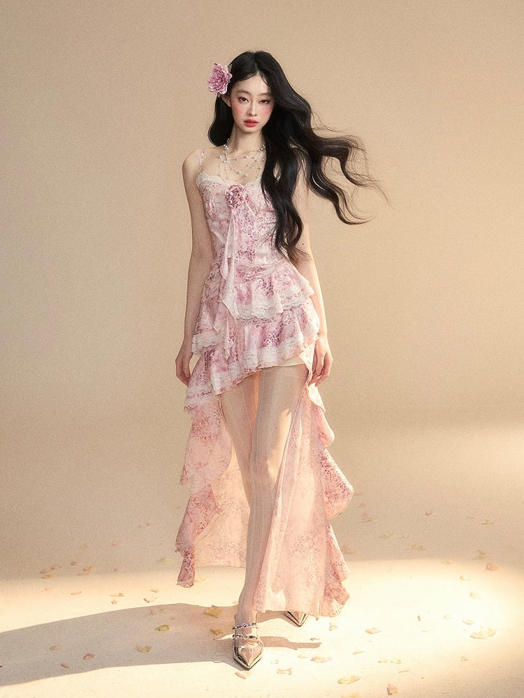 Pink Cascading Ruffle Trim High-low Tiered Skirt Gown Slip Dress