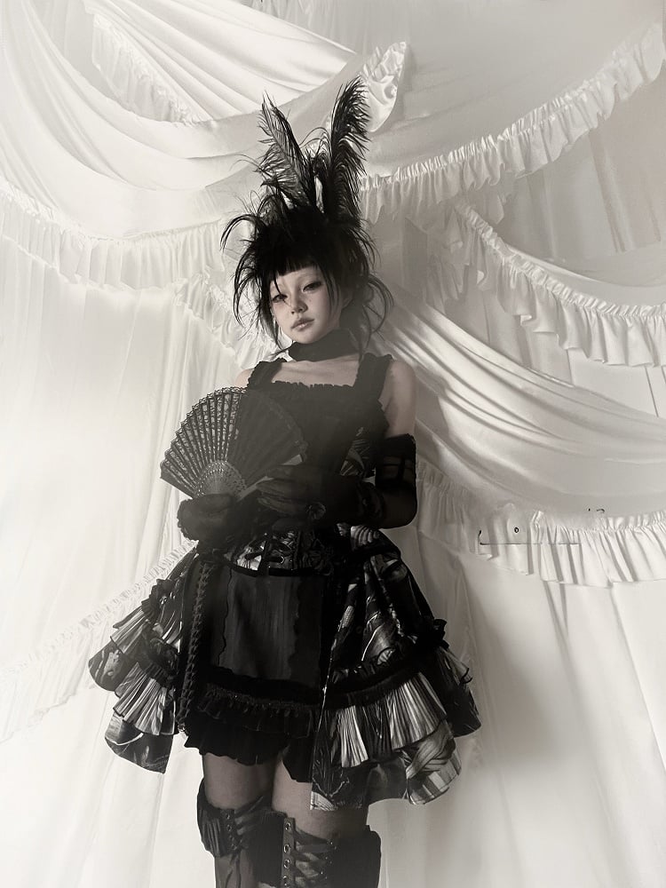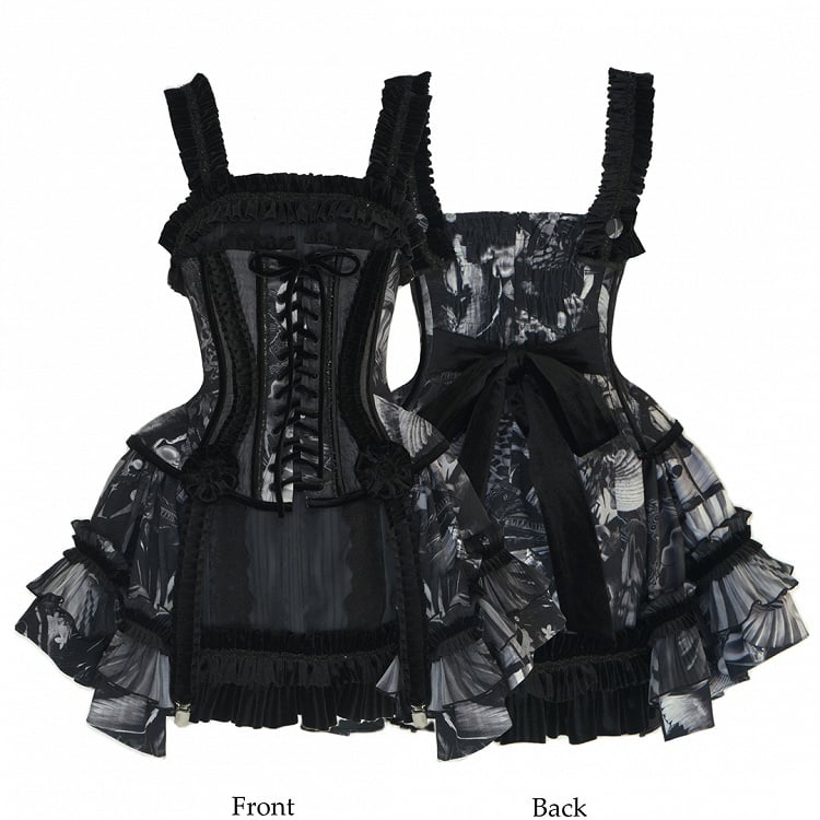 Ruffles and Black Lolita with Boned Short Pearl Shell Gothic Print Dress Corset