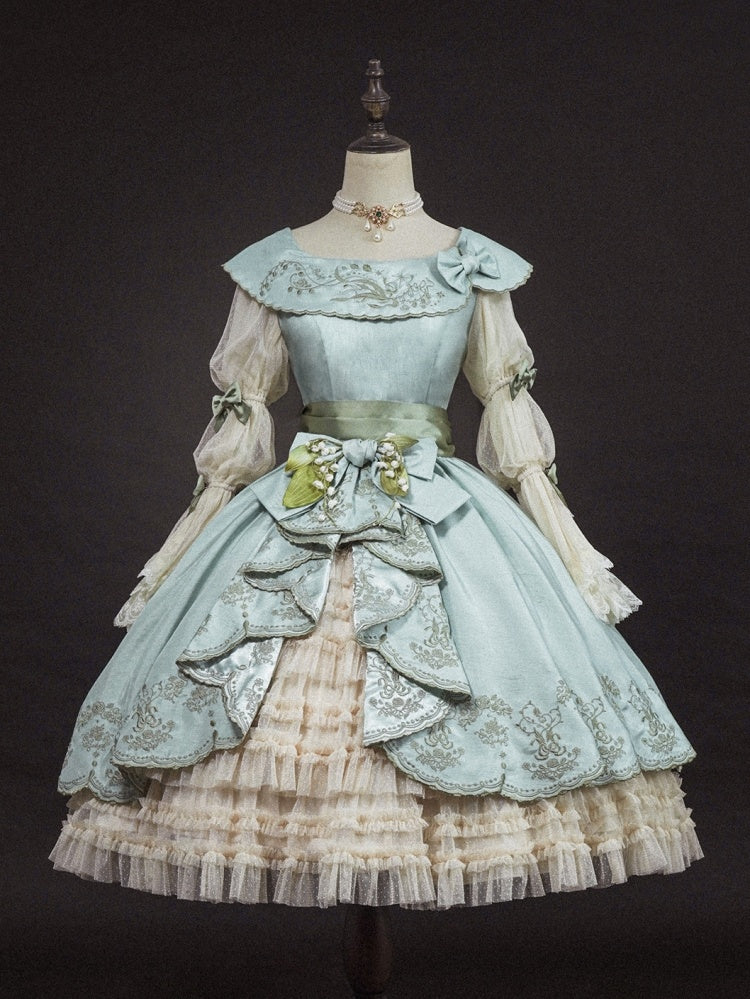 Blue and White Old School Lolita Fashion Dress Bowknot Detais JSK Set