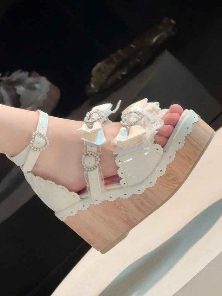 Old School Lolita White Platform Sandals - Beaded Heart Buckles, Wedge Sole & Bow Accents