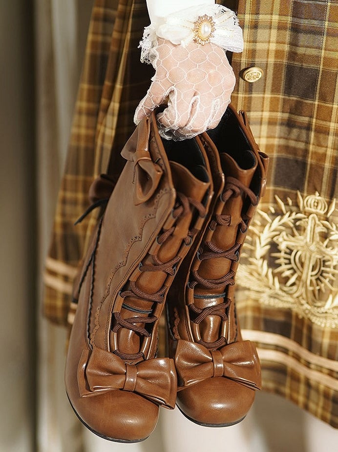 Mid-calf Brown Sweet Lolita Boots with Scalloped Trim & Crisscross Lacing