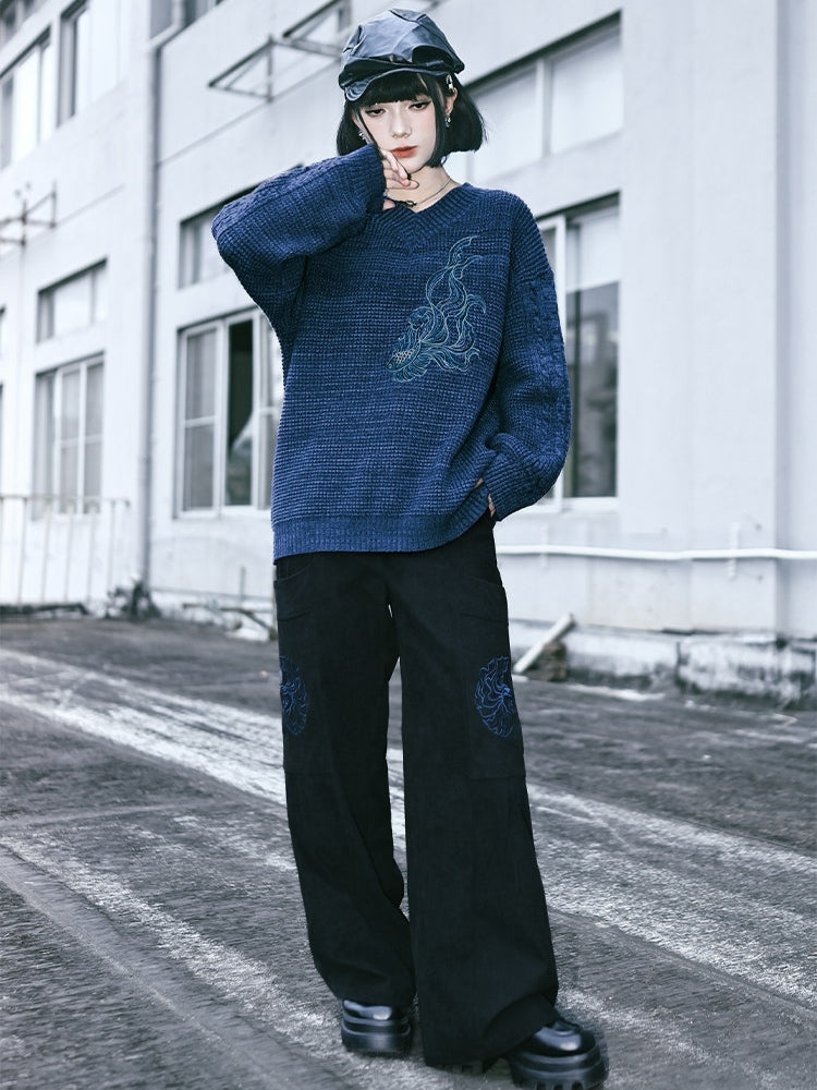 Scarf with Set Embroidery Gothic Goldfish Sweater V-Neck Blue