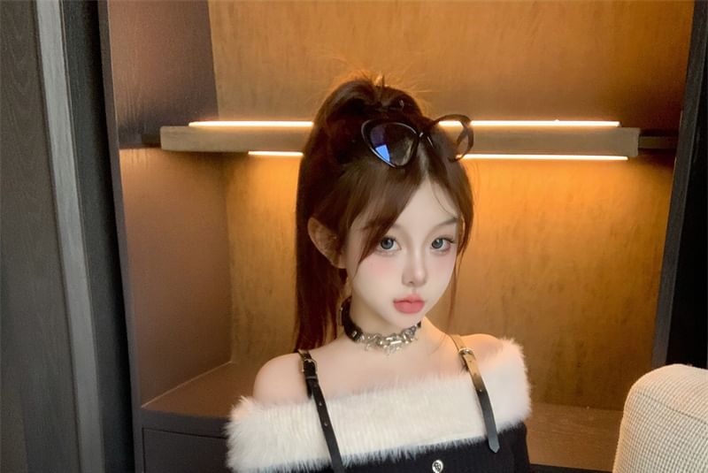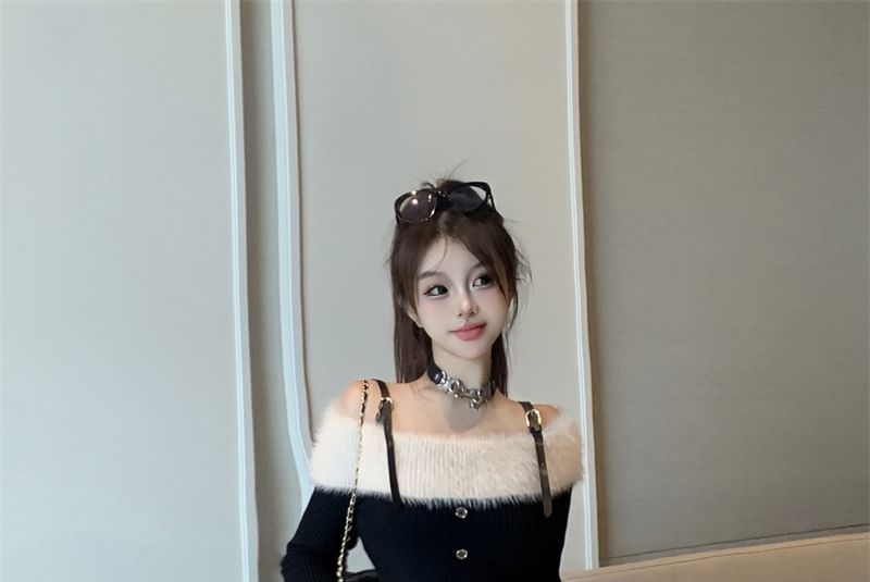 Set: Long-Sleeve Cold Shoulder Two Tone Fluffy Panel Buckled Mini A-Line Knit Dress + Belt