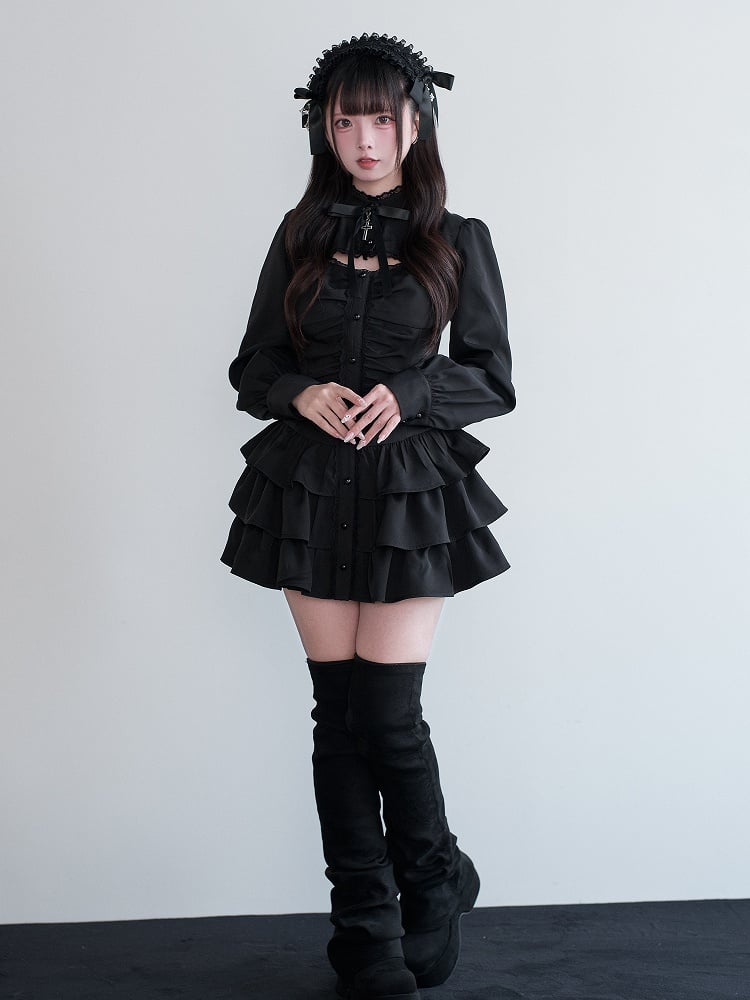 Jirai Kei Black Cut-Out Cross Bow Decor Multi-Layer Ruffled Dress + Matching Shorts Set