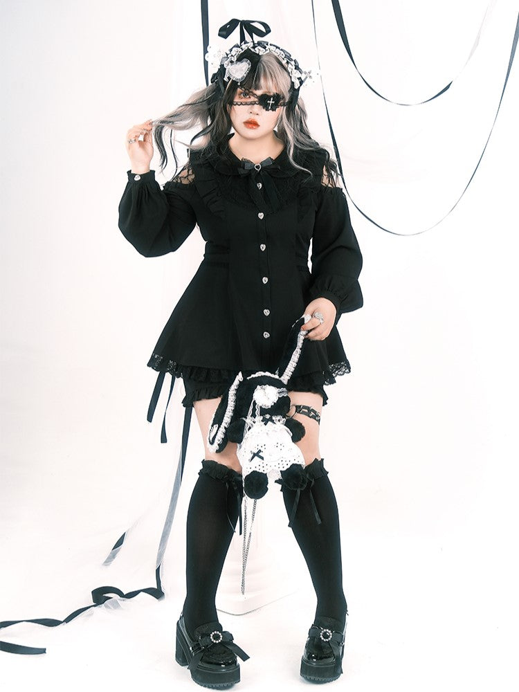 ● Bowknot Details / Cutout Shoulder / Front Button Placket / Lace Applique / Lace Trim / Self-tie Straps