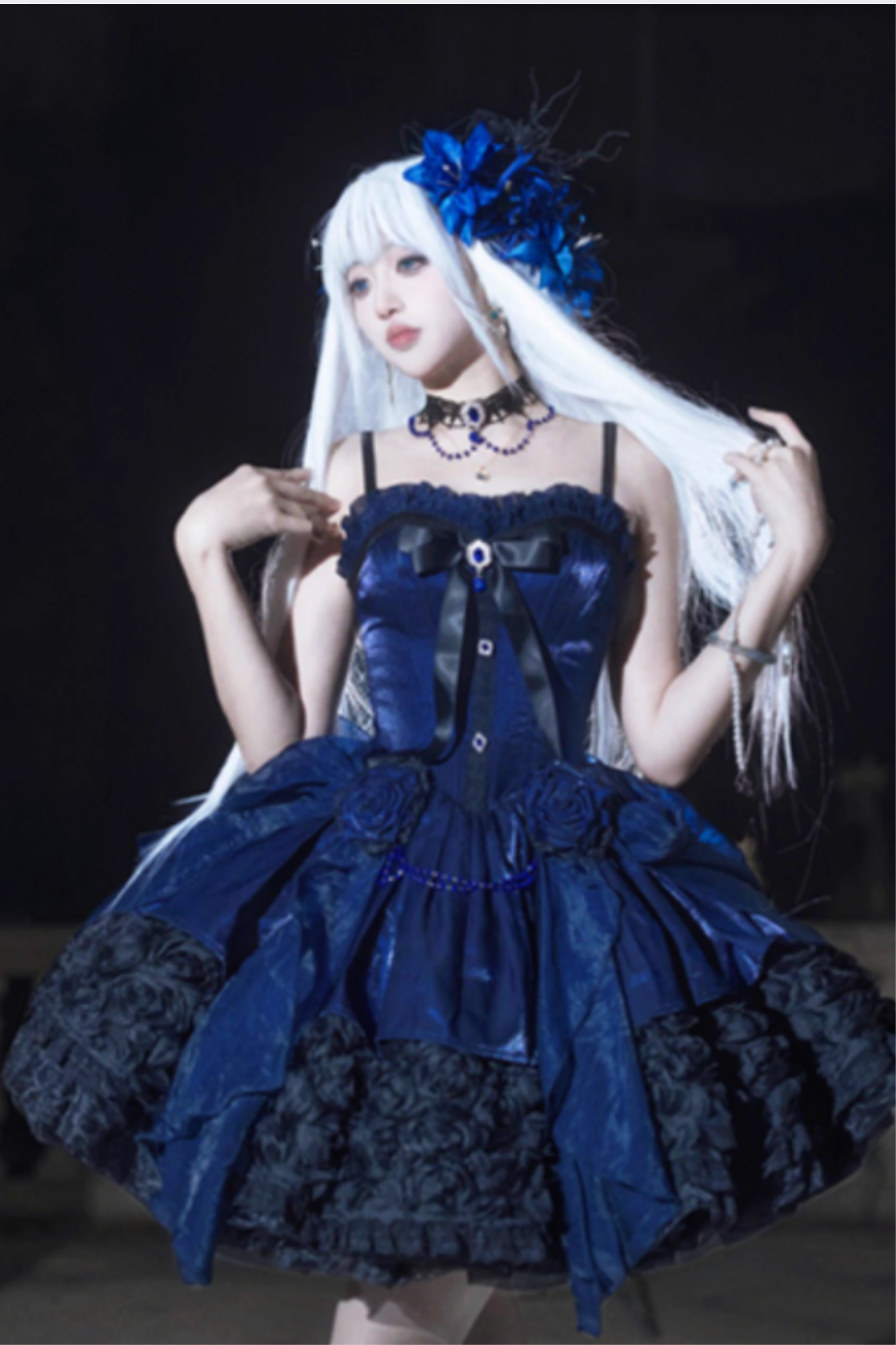 Elegant dress set includes tube top dress + ribbon accessory at bust + black shoulder straps + transparent shoulder straps + 2 rose ball accessories at waist side + full up back skirt.