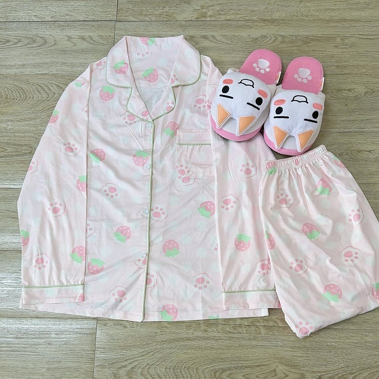 Light Pink Pajama Set - Strawberry & Cat Paw Print