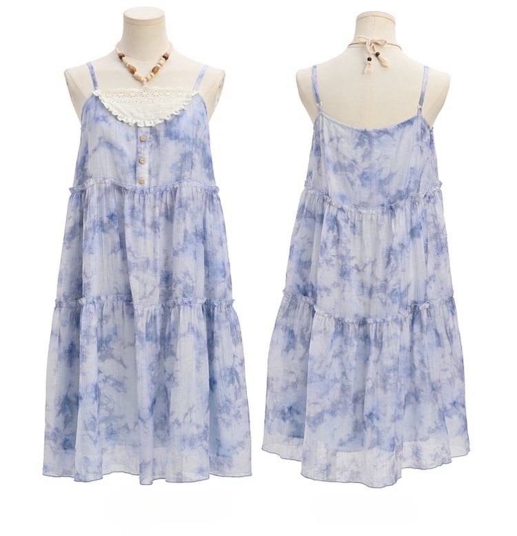 Blue Chiffon Tie Dye Tassel Hem Shell Charm Neckline Loose Slip Dress