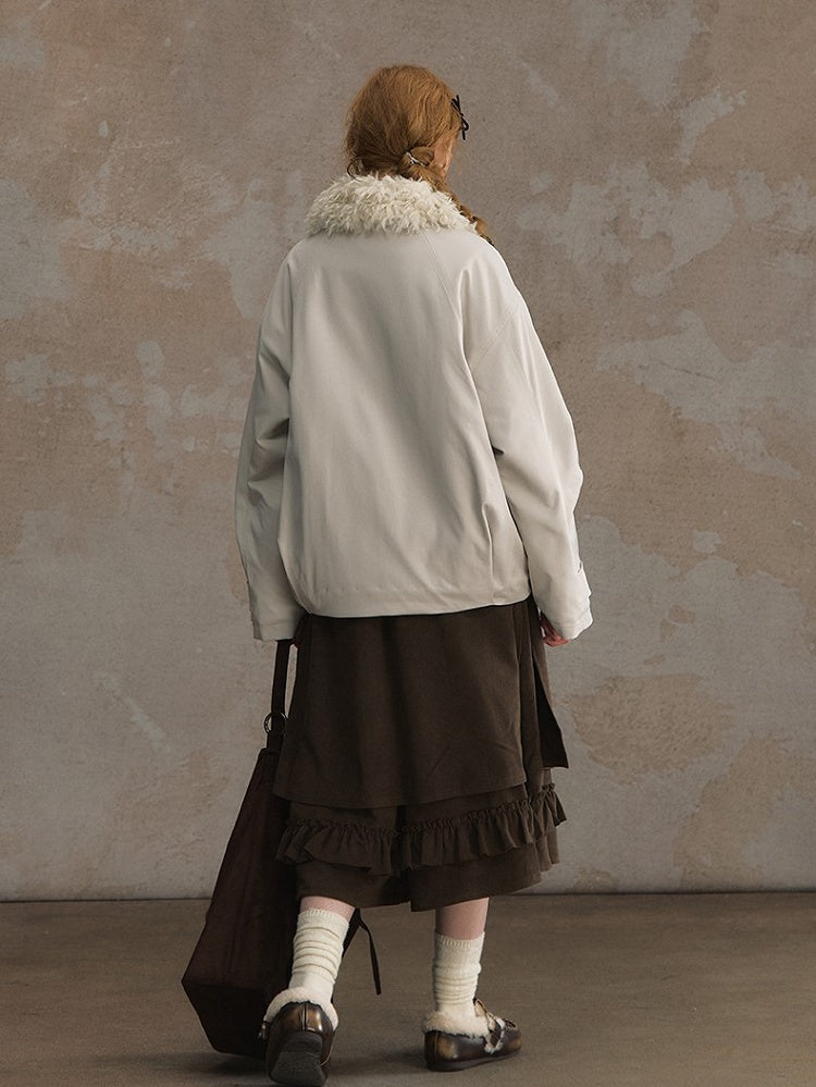 Brown/White Faux Fur Collar Short Jacket with Buckle Belt