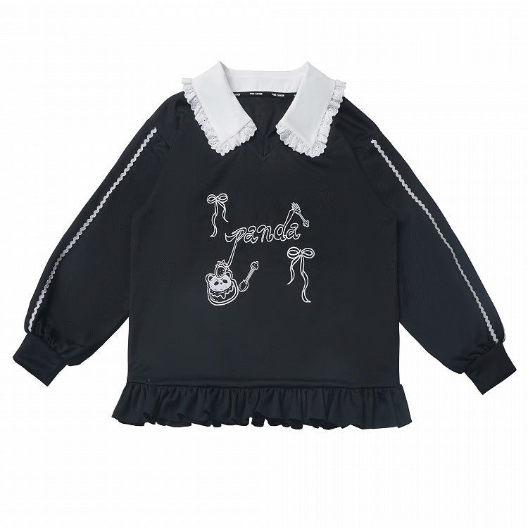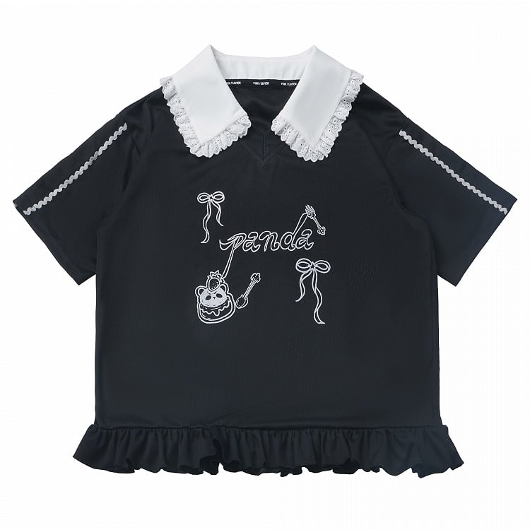 Short/Long Top Sleeves Panda Dessert Print Ruffled Pointed Flat Collar Ruffled Hem Black