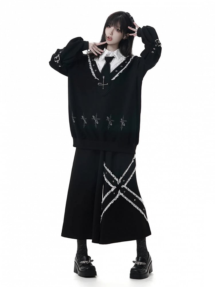 Sweet-Grunge Faux Two-pieces Sweatshirt | Black Dollcore with White Lace Collar and Shoulder Cutouts