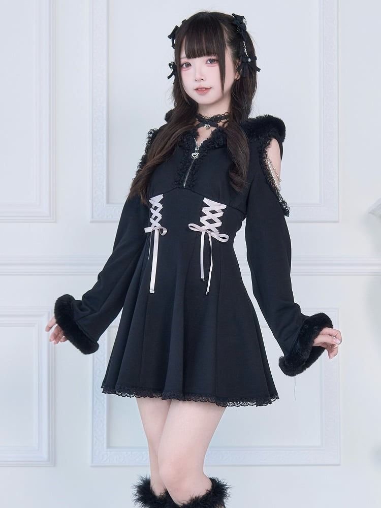 Shoulder Dress: Dark Elegance with Corset Beaded Lacing Jirai Black Hoodie Accents Kei Plush