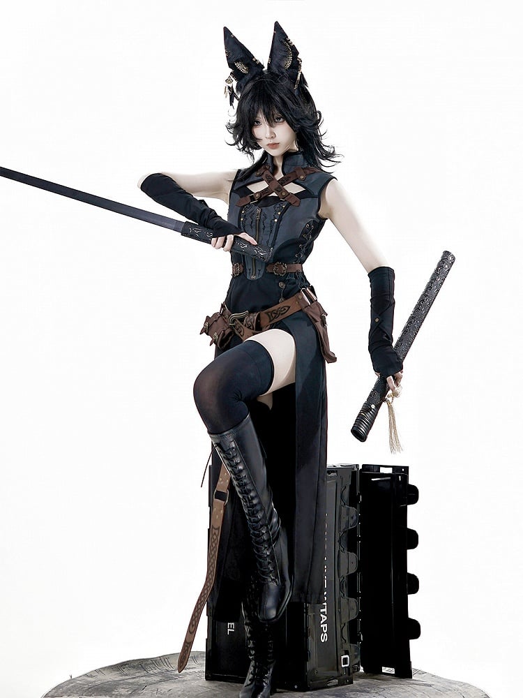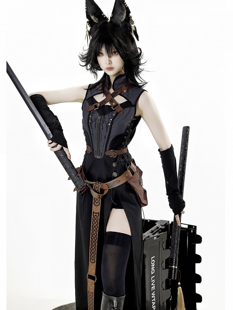 Black and Gray Crisscross Buckle Straps Banded Collar Side Slit Sleeveless Dress