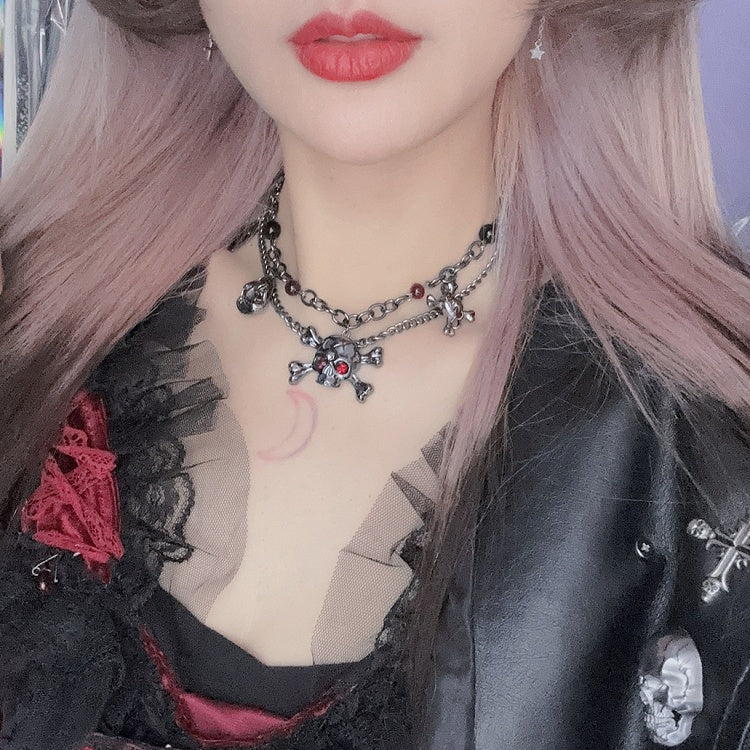 Silver Punk Skeleton And Beaded Decorated Necklace