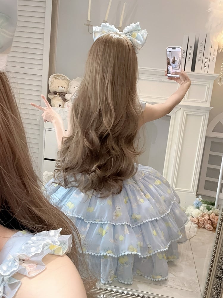 Bear and Lemon Print Tiered Skirt Blue High Waist Lolita Dress
