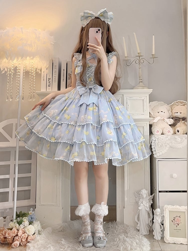 Skirt Bear High Print Blue Tiered Lolita Lemon Waist and Dress