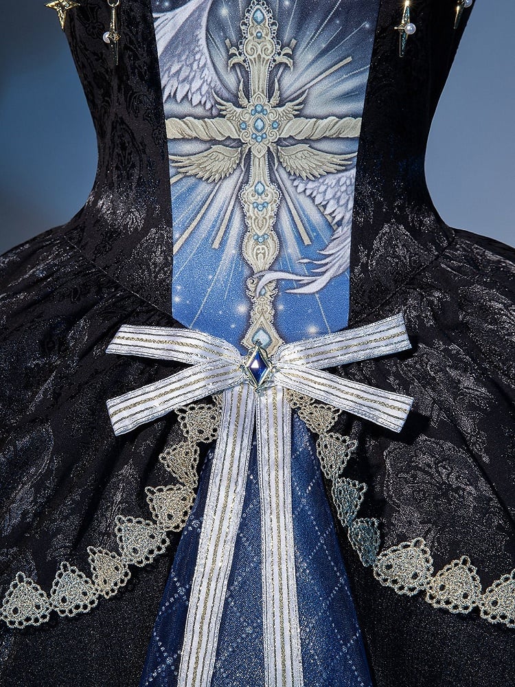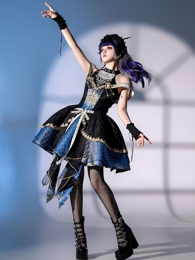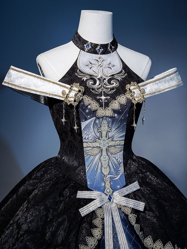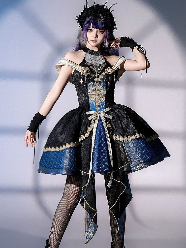 Skirt Gothic Design Cross Off-shoulder and Mock Front Print Jumper Cascading Neck Ruffles