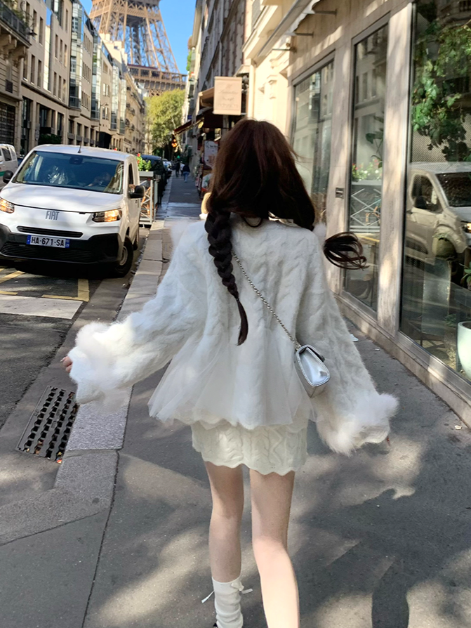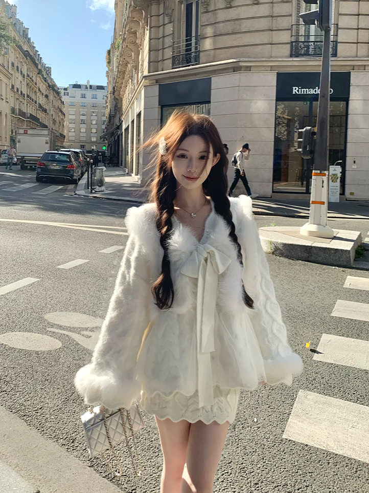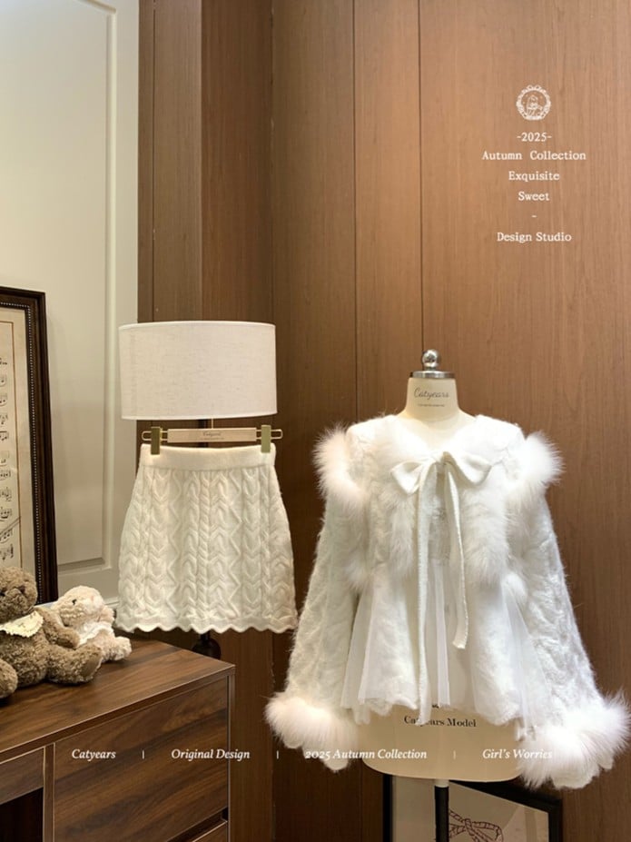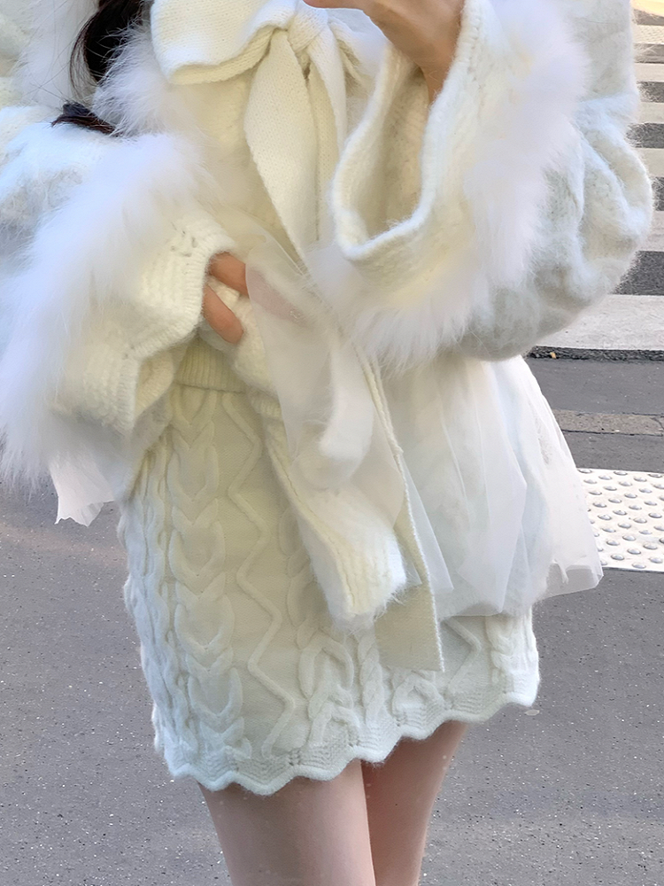 Skirt Knit Top Set Vintage Cable-Knit Frayed-Trim Wool Luxe