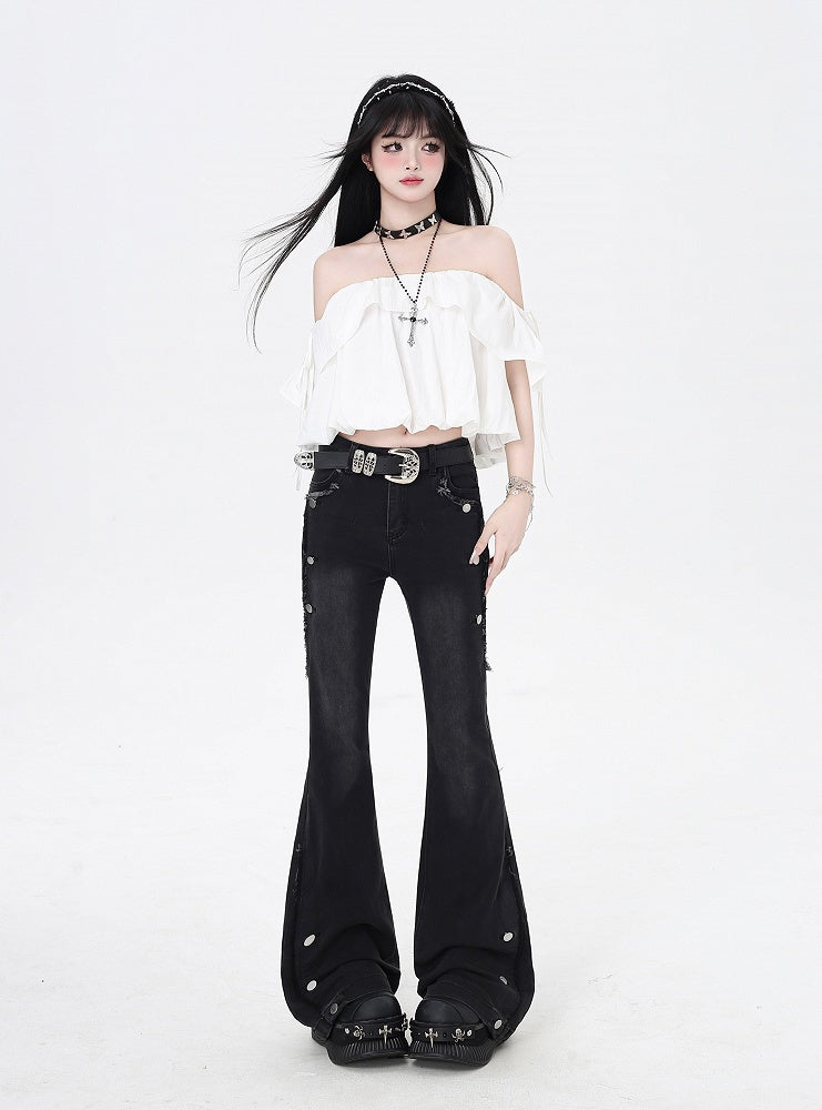 Lolita Buttoned Wide-Leg Panels Ouji with Cincher High-Waisted Draped Pants Black