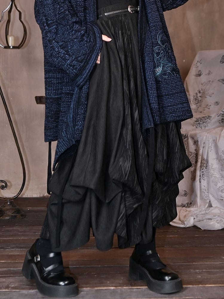 Black Cheongsam Goth Two-Way Skirt - Slant Pockets, Partial Elastic Waist & Built-in Self-Tie Straps