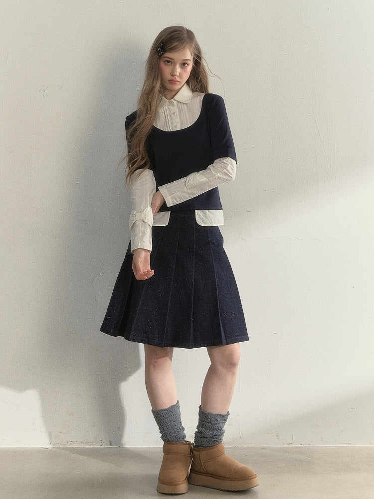 Vintage Navy Blue Fake Two-Piece Long Sleeve Blouse