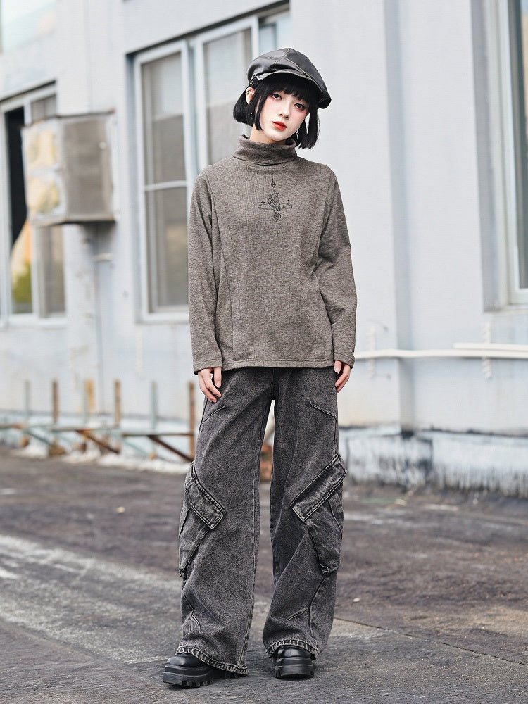 Chinese Style Brown Long Sleeve Top with Fleece Lining, High-neck & Unicorn Pattern