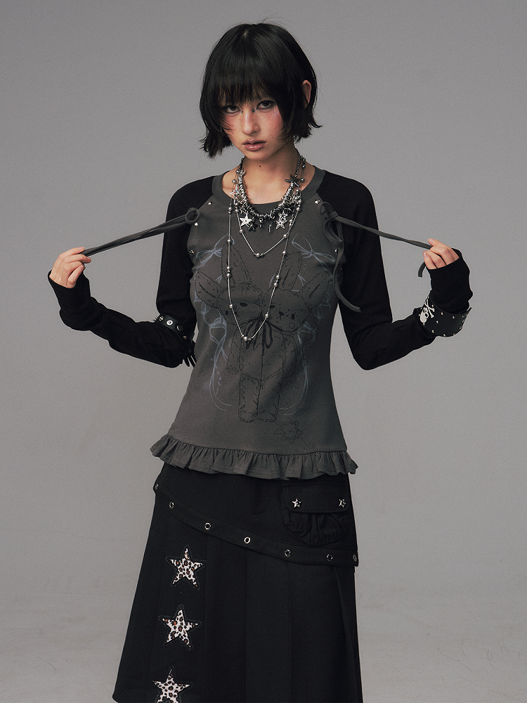 Black&Gray Kawaii Bowknot Details Long Raglan Sleeve Top - Ruffled Trim & Floral Print