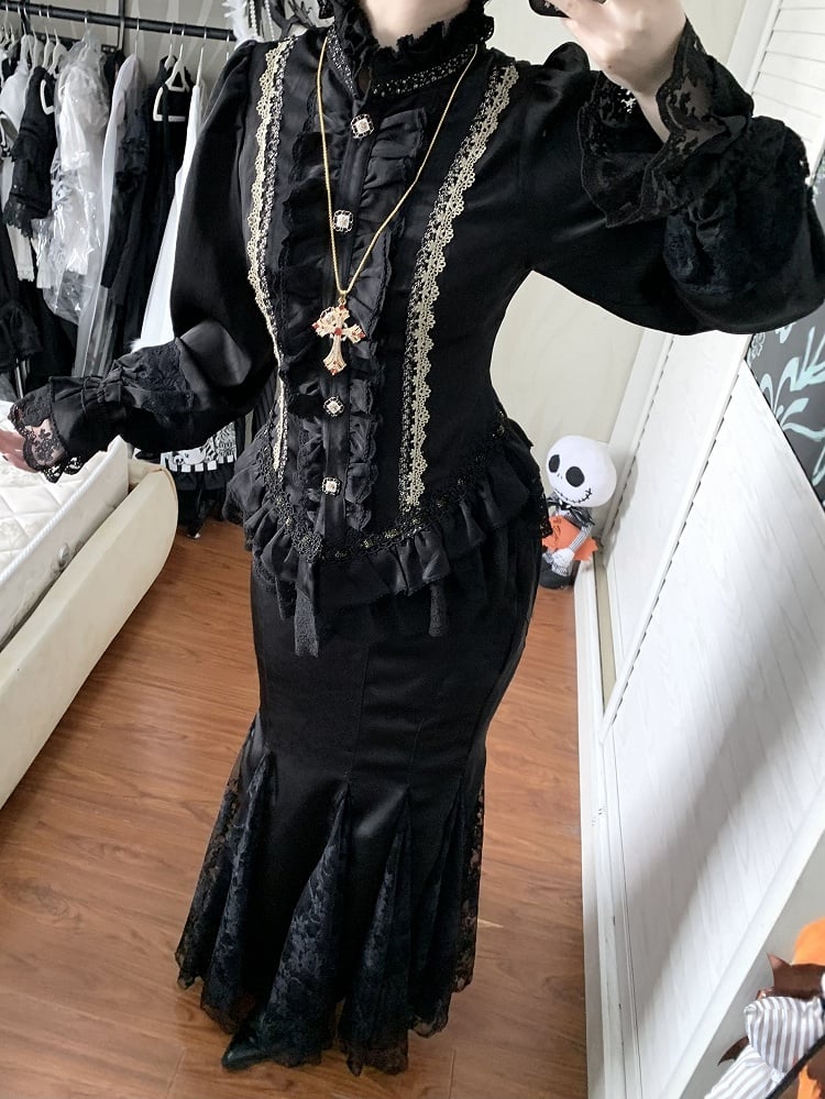 Sleeves Blouse + Ruffled Skirt Lolita Classic Details with Golden Lace Black Mermaid Long Set Elegant
