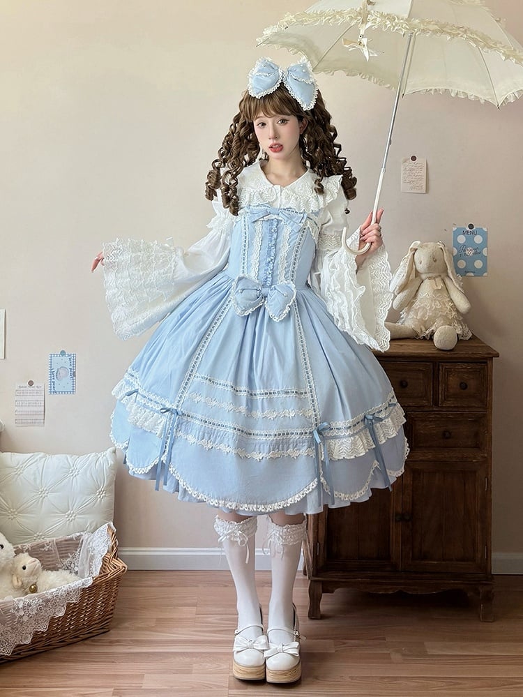 Blue and White Old School Lolita Fashion Dress Bowknot Detais JSK Set