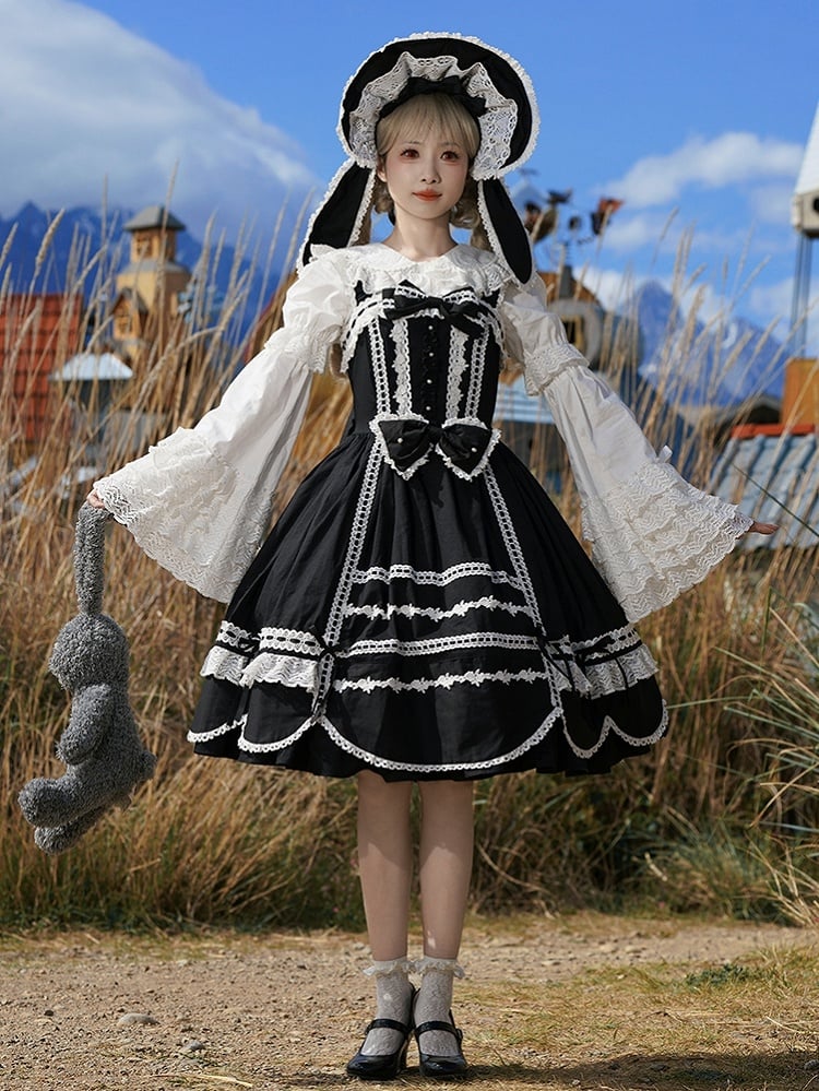Black and White Old School Lolita Fashion Dress Bowknot Lolita JSK Set