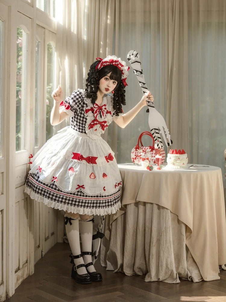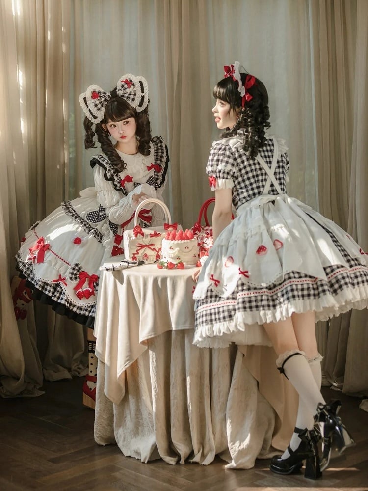 Black & White Gingham Puff Sleeves Sweet Lolita Dress with Strawberry Print
