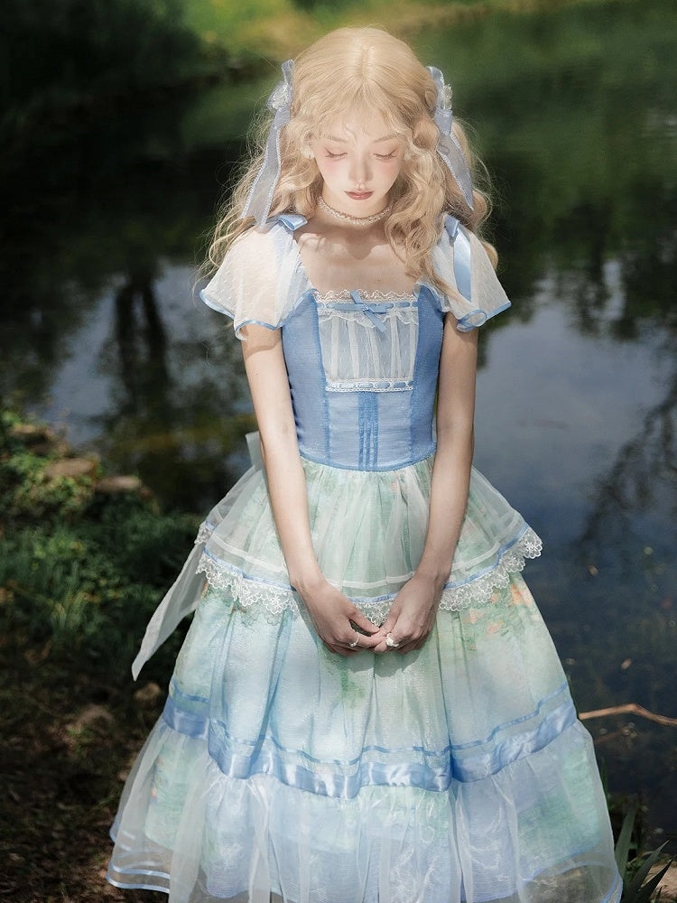 Blue and White Old School Lolita Fashion Dress Bowknot Detais JSK Set