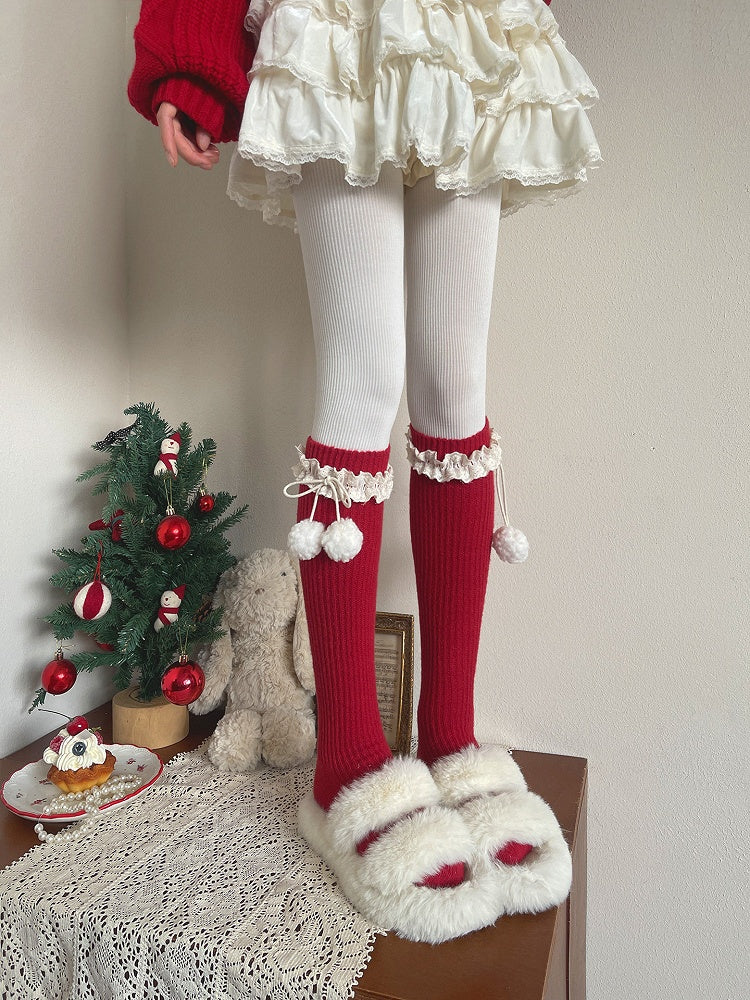 Red / Cream / Black Slouchy Stockings with Lace & Pom-Pom Accents