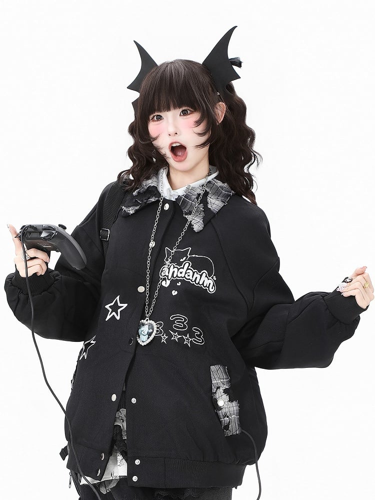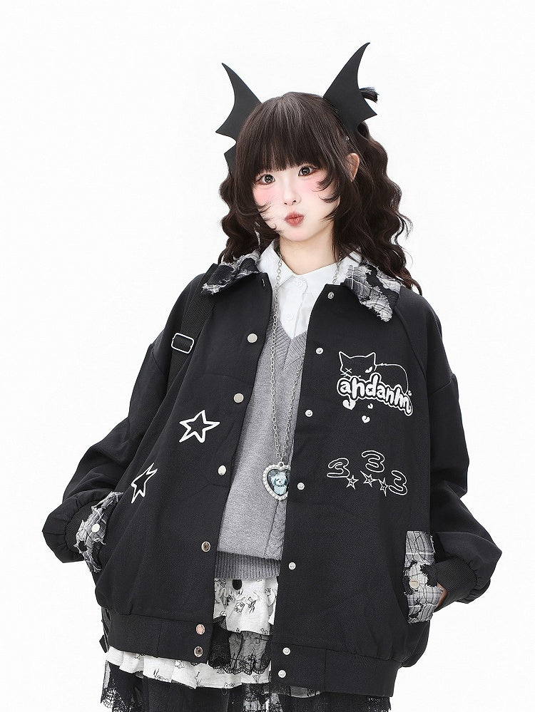 Black Bittersweet Jacket with Snap Placket, Plaid Polo Collar & Kitty Print