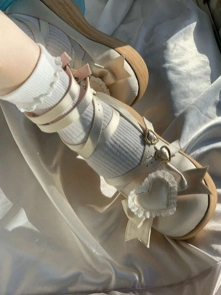 Wood Grain Sole with Crisscross & Heart Snap Satin Champagne Platform Mary Janes in Sweet Lolita